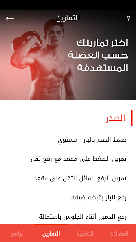 أكثر من 50 تمارين مختلفة للقيام في القاعة الرياضية مع شرح كيفية الممارسة بالصور والعضلات المستهدفة في كل تمرين حسب العضلات الرئيسية في الجسم تمارين الرجيم و ازالة الكرش ,الصدر، البطن، الفخذين، الكتفين، عضلات الساق، الذراعين والساعدين