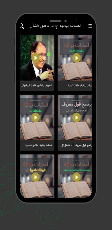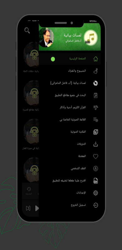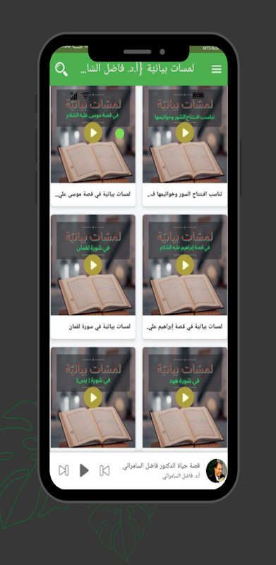 An audio application that includes episodes of the graphic touches program for Dr. Fadel Al-Samarrai and the Holy Quran MP3