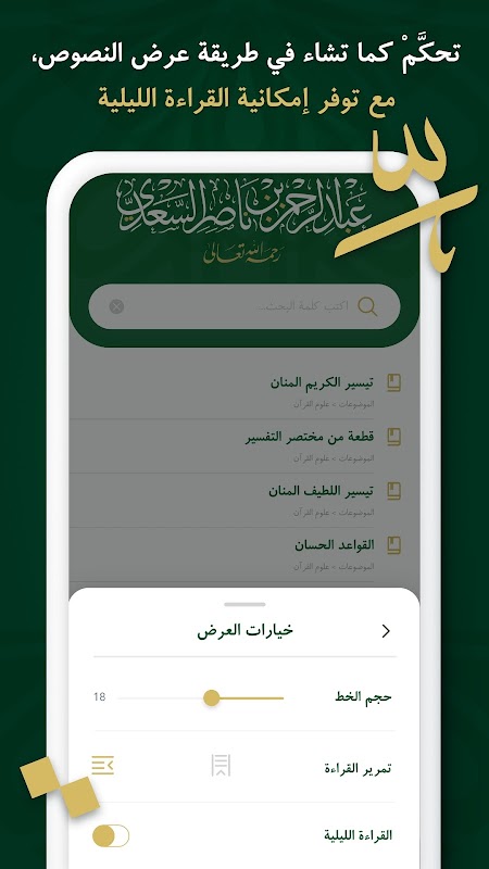 تحكَّمْ كما تشاء في طريقة عرض النصوص، فبإمكانك تغيير نوع الخط ولونه وحجمه، وكذلك لون الخلفية وإمكانية القراءة بالنمط الليلي.