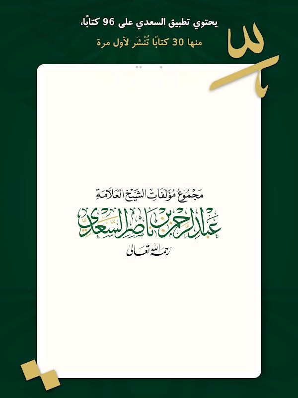 تطبيق مؤلفات السعدي .. مجموعة مؤلفات الشيخ العلامة عبد الرحمن بن ناصر السعدي – رحمه الله – يتضمن مجموع مؤلفات الشيخ السعدي في موضوعات علوم القرآن الكريم، وأشهرها تفسيره «تيسير الكريم الرحمن في تفسير كلام المنان» والمشهور بـ«تفسير السعدي»، كما يضم التطبيق مؤلفات الشيخ السعدي في الحديث الشريف، والفقه، والعقائد، والآداب الشرعية، والأخلاق في الإسلام، والفتاوى الشرعية، وما قدَّمه الشيخ في حياته؛ من دروس في الفقه المقارن، ومراسلات، ومقالات، بالإضافة إلى الخطب والمؤلفات في الفقه وأصوله.