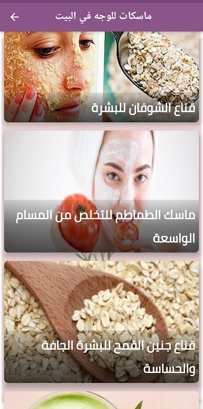 يحتوي التطبيق على اروع الماسكات التي يمكنك تطبيقها في البيت بكل سهولة وبمكونات بسيطة ومتواجدة دوما في مطبخك للحصول على بشرة صافية ونقية ومشرقة دوما ويمكنك تطبيقها مرة في الاسبوع او مرتين ولا ينصح بتكرار هذه الماسكات كثيرا لكي لا تتسبب باضرار للبشرة