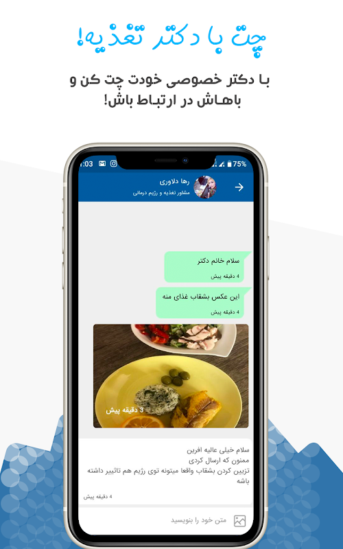 در اپلیکیشن مربی همراه بهترین دکتر های تغذیه و رژیم درمانی حضور دارند که در هرکجای ایران که باشید بدون نیاز به مراجعه حضوری به مطب خاصی و هزینه های زیاد ویزیت به راحتی می توانید زیر نظر بهترین دکتر تغذیه باشید. با ارسال درخواست برنامه تغذیه رایگان و نامحدود با دکتر خود چت کنید و همچنین عکس ارسال کنید.