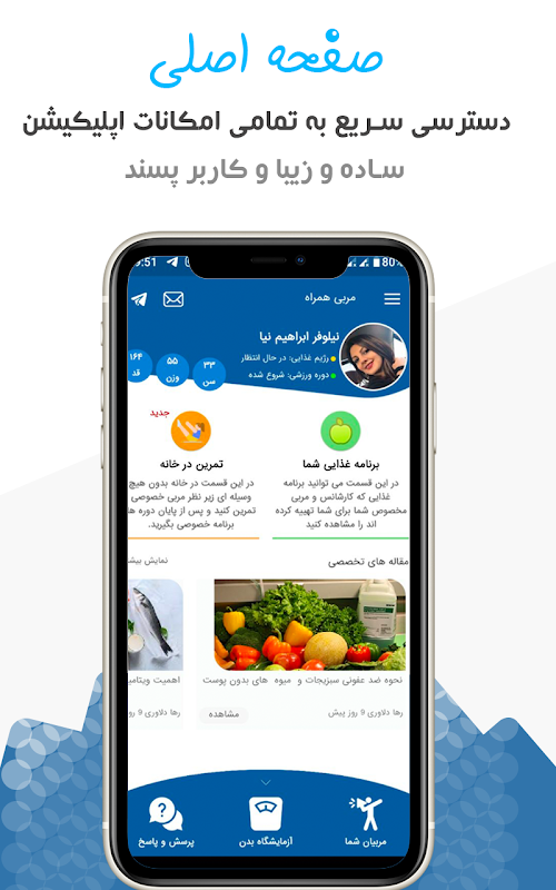 در اپلیکیشن مربی همراه همیشه ۲ مربی کنار شما خواهد بود و روی بدن و تغذیه شما نظارت دارند. بدون اینکه از خونه بیرون برید راحت می تونید به وزن ایده آل برسید. کافیه یک بار امتحان کنید.