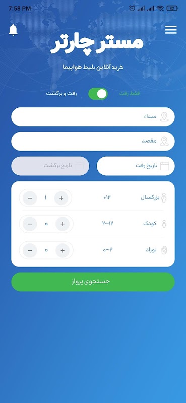 مستر چارتر یک راه ساده تر برای رزرو بلیط هواپیما است که می توانید به کمک آن ارزانترین پرواز های چارتری و سیستمی در مسیر های داخلی و خارجی را پیدا کرده و با کمترین قیمت نسبت به رزرو این پرواز ها اقدام نمایید ، این نرم افزار زیر نظر سازمان هواپیمایی کشوری فعالیت کرده و با دارا بودن پشتیبانی 24 ساعته با خیالی آسوده نسبت به رزرو بلیط خود اقدام نمایید .
