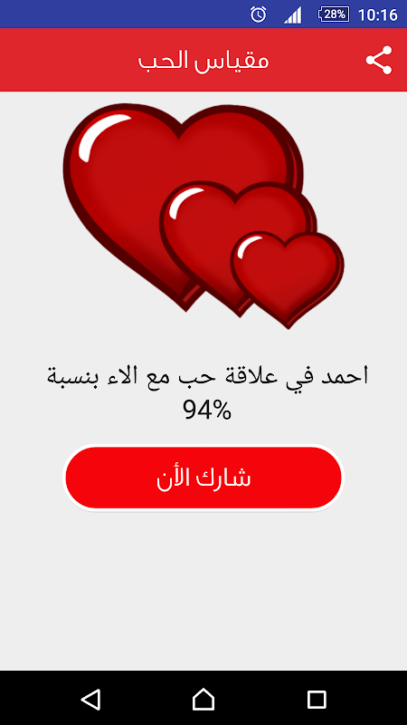ملاحظة : هذا البرنامج غير حقيقي والنسبة التي سوف تظهر لا تعني النسبة الحقيقية.اجمل حب في تطبيق مقياس الحب و آلة الحب و نسبة التوافق و نسبة الحب حاسبة الحب بينك وبين حبيبك .