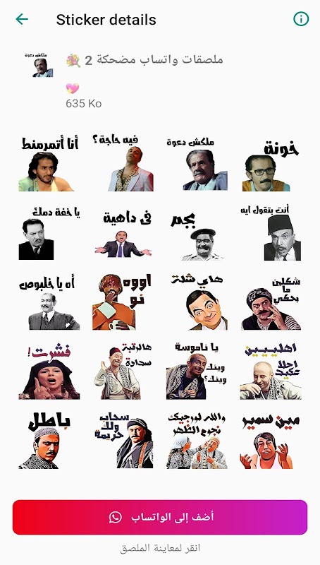 The program contains a lot of funny stickers and comic stickers for WhatsApp, such as: play posters (Adel Imam, Al-Eyal Kabart, Al-Wad Sayed Shaghal), Egyptian stickers (Mohamed Saad, Al-Lambi), Gulf stickers (Tash Ma Tash, Nasser Al-Qasabi, Abdullah Al-Sadhan) and many more! In the event that there are any suggestions for posters that you would like to see in the upcoming updates, please contact us and we will work to achieve this.