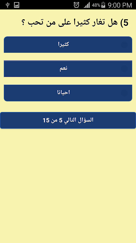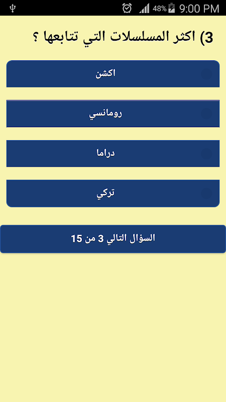 يتكون هذا الاختبار من 15 سؤال من نوع الاختيار من المتعدد قم بالاجابة عن الاسئلة لكي يقوم التطبيق بمقارنة اجاباتك مع الشخصية التي تشبهك في باب الحارة.