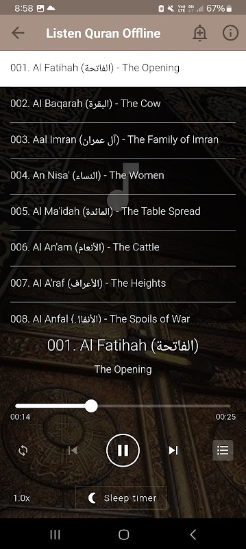 ✔️ Sleep 😴 timer ⏲️⏳️. Set the duration you want and the quran recitation will stop automatically when this duration is elapsed.