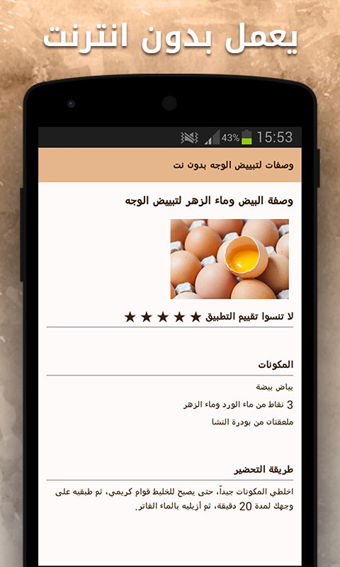يحتوي تطبيق وصفات لتبييض الوجه بدون نت على عدة وصفات منزلية سهلة لجمال طبيعي متجددة بإستمرار و هذه بعضها