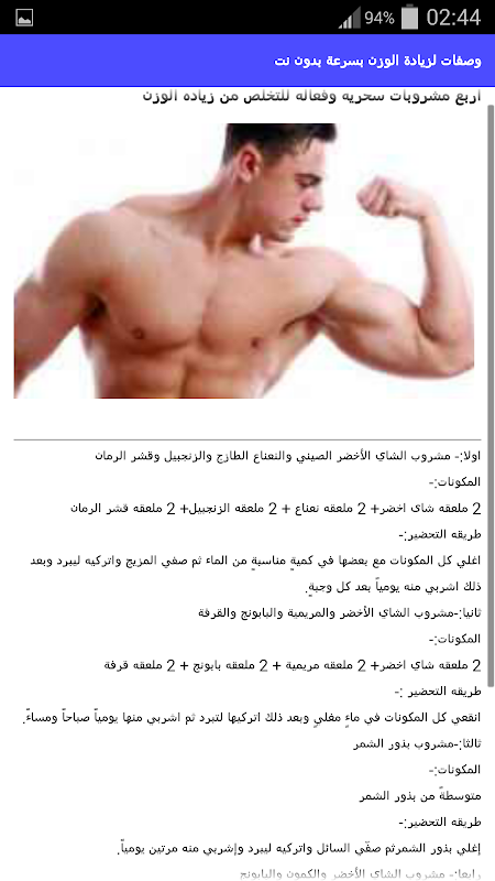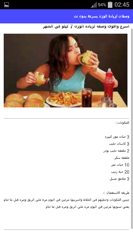 يحتوي التطبيق على عدة وصفة لزيادة الوزن بسرعة بدون أنترنيت متجددة بستمرار و هذه بعضها :