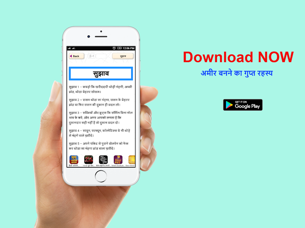 Our developer team builds the app called How To Become Rich. There are a few Tips To getting Rich of thumb that those who want to know how to get rich would do well to observe. Learning How To Become Rich Money Mantras is no more difficult than studying the piano or learning to paint. By changing the way you look at money, you'll realize there is nothing standing between you and your dream but your own self-imposed limitations and actions. There are vital Rules of The Rich and Wealthy for all Indians are included in this app. Most of us are trying to become wealthier and we have to accumulate it. To do so, you need to understand how to manage cash flow and investments. By using our app you can easily get the way to How To Become Rich in Hindi and it’s a free app for all users. Here is the single most crucial thing you'll ever hear about investing: Getting rich is simple. Not easy, but simple. And here is the second most crucial thing you'll ever hear about investing: you've no excuse not to do it. So Think And Grow Rich.