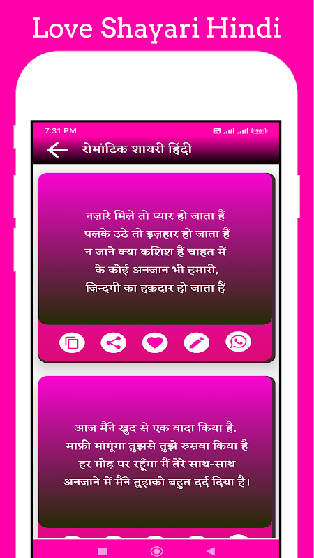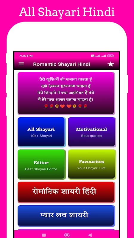 This app is the right place for Specially Romantic Shayari in every in class categories like Romance ,Miss you Shayari, Pyar Shayari, Mohabbat Shayari, Propose Shayari etc.