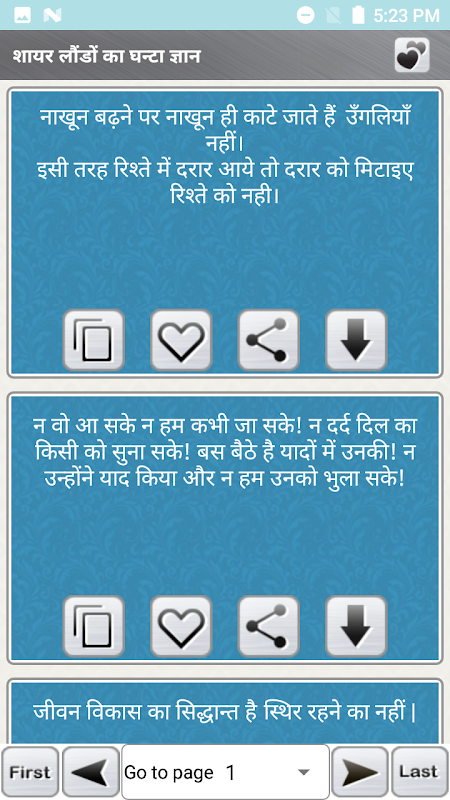 हमनें इस एप्प में शायर लौन्डों की फनी हिन्दी शायरी और status messages को शामिल किया है जिन्हें आप अपने social sites पर इस्तेमाल कर सकते हैं. social नेटवर्क पर अपनी दिल से जुडी बातों को स्टेटस बनाकर दूसरों से शेयर करना आजकल एक प्रथा सी बन गया है. सभी लोग अपनों के साथ हँसी मजाक नोक झोंक करना और अपने प्यार और जिंदगी से जुडी बातों को साझा करना पसंद करते है.