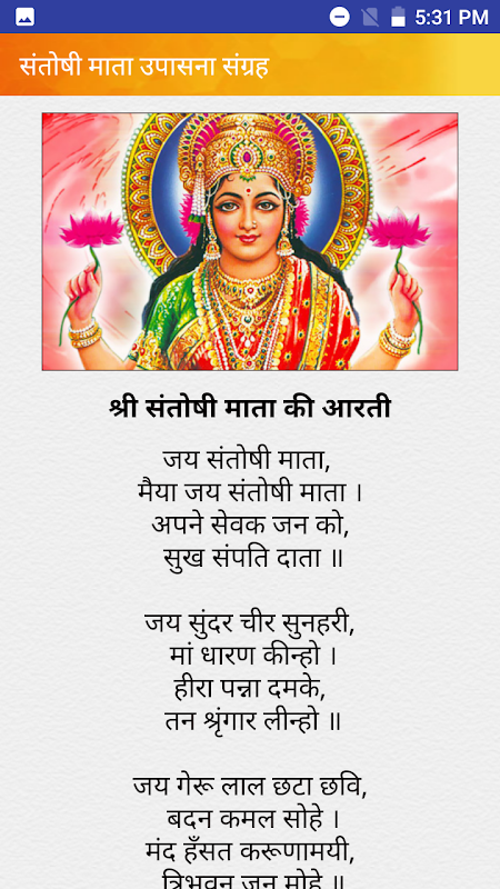 This is a free app containing complete collection of aarti chaalisa mantra & pooja katha of goddess maa santoshi. Santoshi mata is one of the most worshipped goddess in the Hindu pantheon. Santoshi Mata is particularly worshipped by women of India to get happiness and wealth as she is venerated as "the Mother of Happiness".