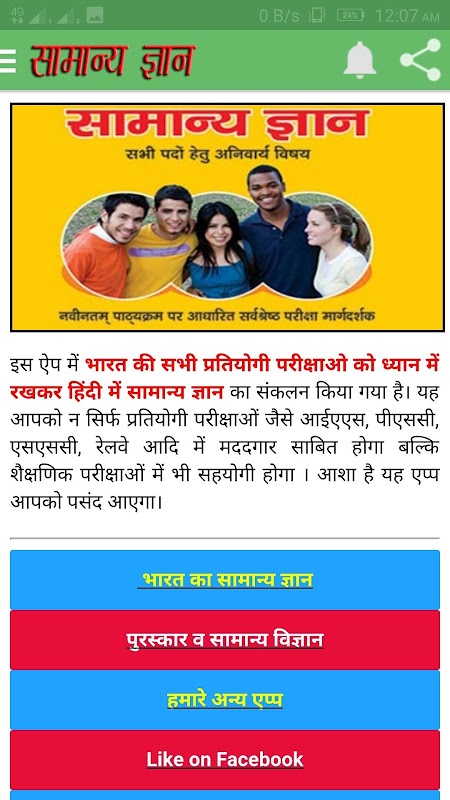 इस ऐप में भारत की सभी प्रतियोगी परीक्षाओ को ध्यान में रखकर हिंदी में सामान्य ज्ञान का संकलन किया गया है। यह आपको न सिर्फ प्रतियोगी परीक्षाओं जैसे आईएएस, पीएससी, एसएससी, रेलवे आदि में मददगार साबित होगा बल्कि शैक्षणिक परीक्षाओं में भी सहयोगी होगा । आशा है यह एप्प आपको पसंद आएगा।