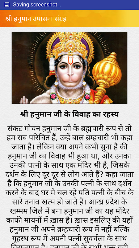 App also has a lot of devotional topics such as हनुमान जी के 108 नाम के मंत्र Ram bhakt hanuman ki gaatha हनुमान जी के विवाह का रहस्य Hanuman katha and stories such as बाल हनुमान ने ऐसा क्या किया कि उनका नाम हनुमान रख दिया गया or हनुमान क्यों हुए सिंदूरी and जब कुंवारे श्री हनुमान जी को लड़ना पड़ा अपने ही पुत्र से or जब श्री हनुमान जी के कोप से बचने के लिए शनि देव को बनना पड़ा स्त्री and ये वो काम हैं जो केवल कर सकते थे श्री हनुमान etc.