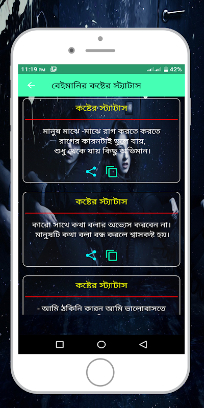 অভিমানী কষ্টের স্ট্যাটাস এই অ্যাপসটি থেকে সকল ধরনের কষ্টের এস এম এস ও স্ট্যাটাস পাবেন। আপনার মনের অনেক ধরনের কষ্ট থাকতে পারে এক মাএ এই অ্যাপসটি থেকে সকল ধরনের দুঃখ স্ট্যাটাস পাবেন। যা অনলাইনে শেয়ার করে মনের কষ্টটারে একটু দূর করতে পারবেন। অভিমানী কষ্টের স্ট্যাটাস-sad status post.
