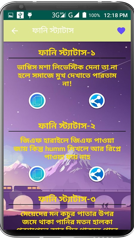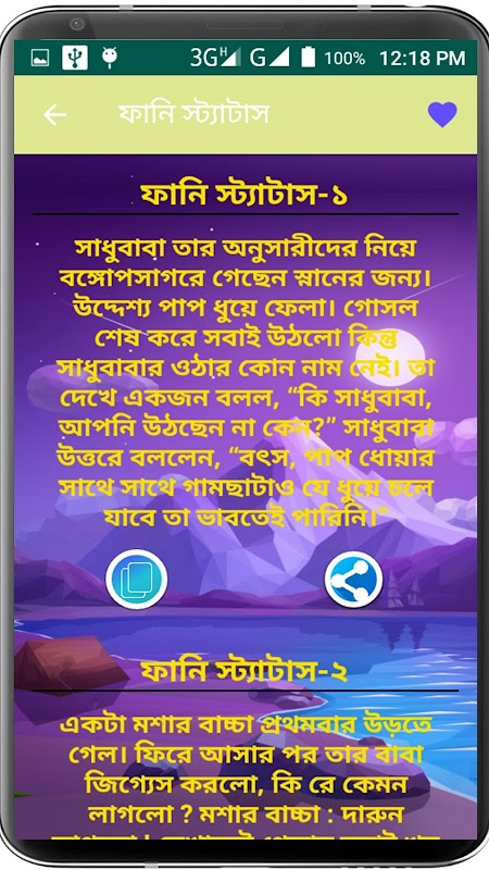 অস্থির সব ফানি স্ট্যাটাস 2020 আ্যাপটি আপনাদের কে স্বাগতম । অ্যাপটিতে রয়েছে সব ধরনের ফানি স্ট্যাটাস । আ্যাপটির স্ট্যাটাসগুলো বিভিন্ন জায়গা থেকে কালেকশন করে বাছাই করে নেওয়া হয়েছে।আপনাদের সুবিধার জন্য দুটি বাটন রাখা হয়েছে একটি হলো শেয়ার এবং অন্যটি হলো কপি বাটন।
