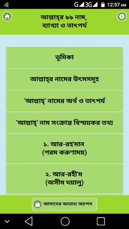 This is a collection of 99 names of Allah. The app for 'Asmaul Husna' will help you understand the names of Allah with Arabic, English and Bengali meaning and significance of the beautiful nine names with reference to Allah.