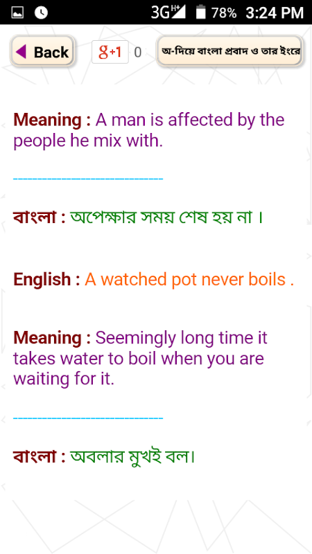 This app provides best collection of favorite and regularly saying proverbs for English and Bengali speakers (proverb in english to bangle, proverbs in English). One can enhance the skill of speaking by uttering these proverbs (proverbs in english to bengali, probad bakko বা প্রবাদ বাক্য). By saying proverbs (english probed), anyone can easily attract the attention of others.