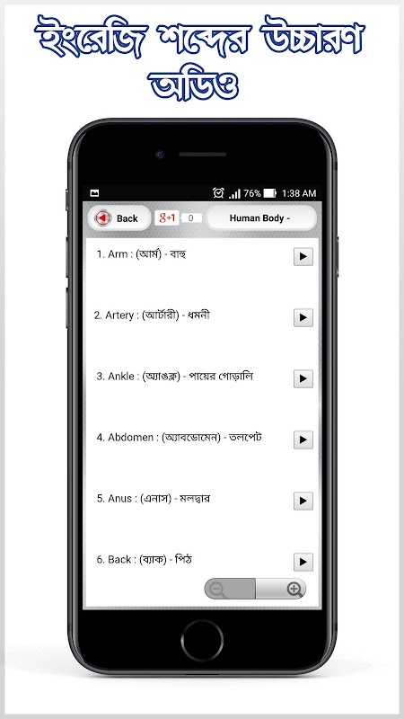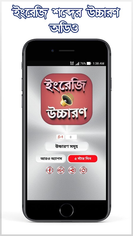 Spoken English অর্থাৎ ইংরেজিতে কথা বলার জন্য ইংরেজি শব্দ বাংলা উচ্চারণ জানা আমাদের জন্য খুবই প্রয়োজনীয়। ইংরেজি শব্দ বাংলা উচ্চারন ভালো ভাবে জানা থাকলে আমরা ইংরেজিতে কথা বলতে পারবো। ইংরেজি উচ্চারন সঠিক তাহলে আপনার স্পোকেন ইংলিশ ও সঠিক হবে। উচ্চারণ সহ ইংরেজি শব্দ শিখুন সঠিক ভাবে আমাদের এই অ্যাপের মাধ্যমে। উচ্চারণ সহ ইংরেজি শব্দ শিখুন, ইংরেজি শব্দের বাংলা অর্থ ও উচ্চারণ Vocabulary app গুলো আপনাদের উপকারে আসবে। ইংরেজি উচ্চারণ, ইংরেজি উচ্চারণ শিখুন সহজেই এই অ্যাপটির সাহায্যে। ইংরেজি উচ্চারণ শেখার নিয়ম জানতে পারবেন। এ ছাড়া idoms and phrases app bangla.
