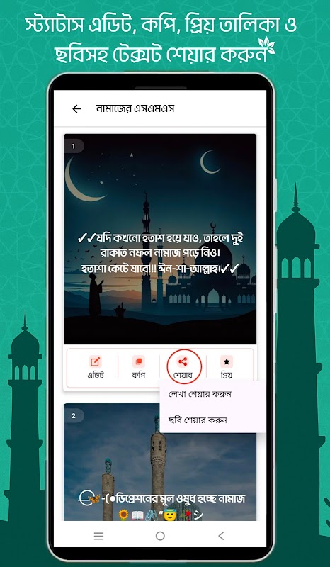 This app contains small Islamic captions, images and various features of different status categories that will touch your heart. You can easily copy, share or edit as your own. Daily morning, night or Ramadan, Jumma, Namaz and the beloved Prophet (PBUH) are heart touching writings. There are also English-Bangla captions, Islamic bios and stylish statuses that you can use on your social media. This app is designed to be simple, meaningful and user-friendly, focusing on the user's feelings, Iman and spiritual power.