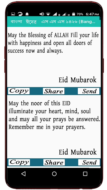 সামনে আসছে ঈদ - eid তাই আমরা আপনাদের জন্য নিয়ে এলাম ঈদের শুভেচ্ছা মেসেজ। ঈদে আপন জনদের ঈদ মোবারক শুভেচ্ছা এস এম এস পাঠাতে হয় আর এসএমএস পাঠাতে হলে প্রয়োজন হয় সুন্দর ছন্দ মেলানো ঈদের শুভেচ্ছার মেসেজ কিন্তুু অনেকেই পারেন না মেসেজ সিজিয়ে লিখতে তাদের জন্য আমাদের এই অ্যাপটিতে থাকছে বেশ কিছু eid sms যেটা ভালো লাগে কপি বা সেন্ড অপশনে ক্লিক করে আপন জনদের কে পাঠিয়ে দিন।
