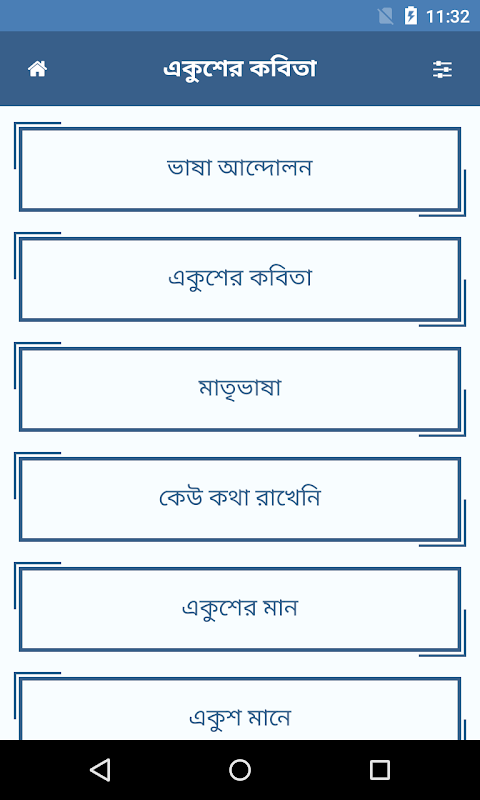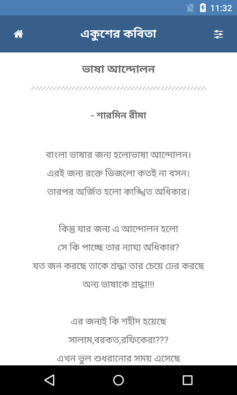 You can find this app using those keywords in Google Play: ekusher kobita | ekushey february kobita | ekusher kobita bangla | ekusher kobita abritti | chotoder ekusher kobita | 21 february bangla kobita | bangla ekusher kobita | ekushey february poem bengali | omor ekushey kobita bangla | amor ekusher kobita | ekushey february bangla kobita