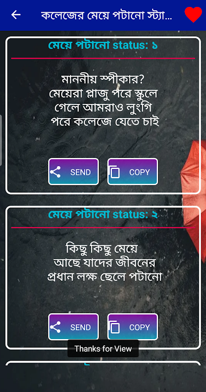 এখানে যে স্ট্যাটাস গুলো আছে আপনি আপনার সকল Frinend দের সাথে সেয়ার কারতে পারবেন ।
