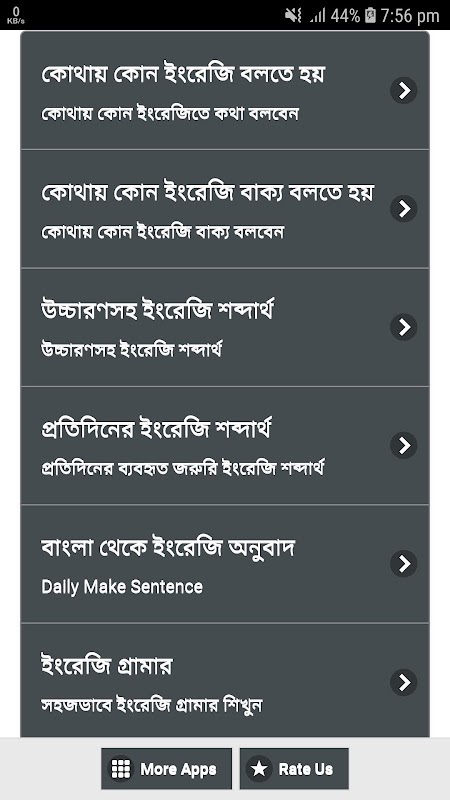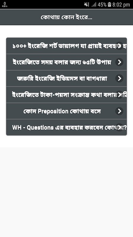 Spoken English Conversation in Bangla কোথায় কোন ইংরেজি বলবেন অ্যাপটি আসলে ইংরেজিতে কথা বলার সহজ উপায় হিসেবে কাজ করবে। এই ইংলিশ স্পিকিং কোর্স এর মাধ্যমে আপনি খুব সহজেই দৈনন্দিন জীবনে ব্যবহৃত ইংরেজি বাক্যের বাংলা অনুবাদ জানতে পারবেন। আমি কিভাবে ইংরেজি বলতে পারি যারা বলেন তাদের বলব ইংরেজিতে কথা বলার সহজ কৌশল হচ্ছে ইংরেজিতে কথোপকথন অনুশীলন করা। কেননা, আপনি যতই উচ্চারণসহ ইংরেজি শব্দার্থ শিখুন , যতই ইংলিশ গ্রামার শিখুন ইংলিশ ডায়ালগ না জানলে আপনি কথা বলতে গেলে আটকে যাবেন।