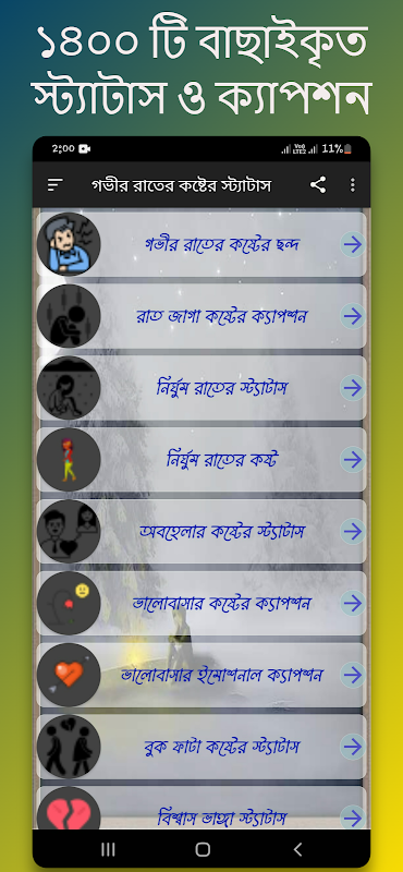 "Late Night Sadness Status" is an app where you can express your deepest feelings. It can be your companion to express loneliness, depression or life's unexpected moments into words.