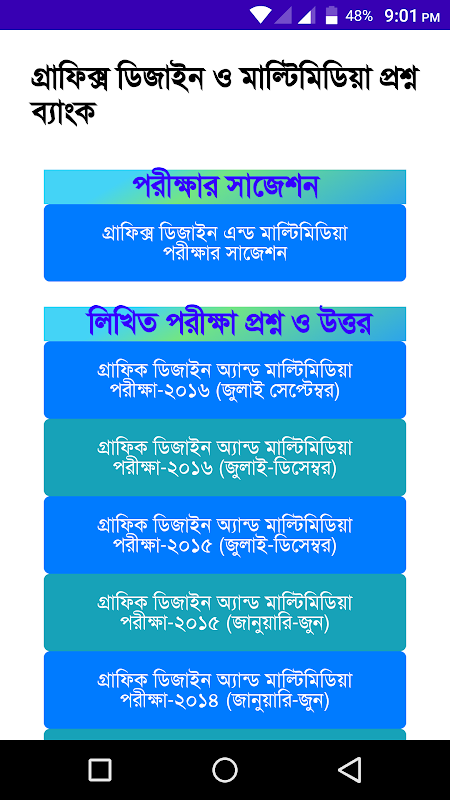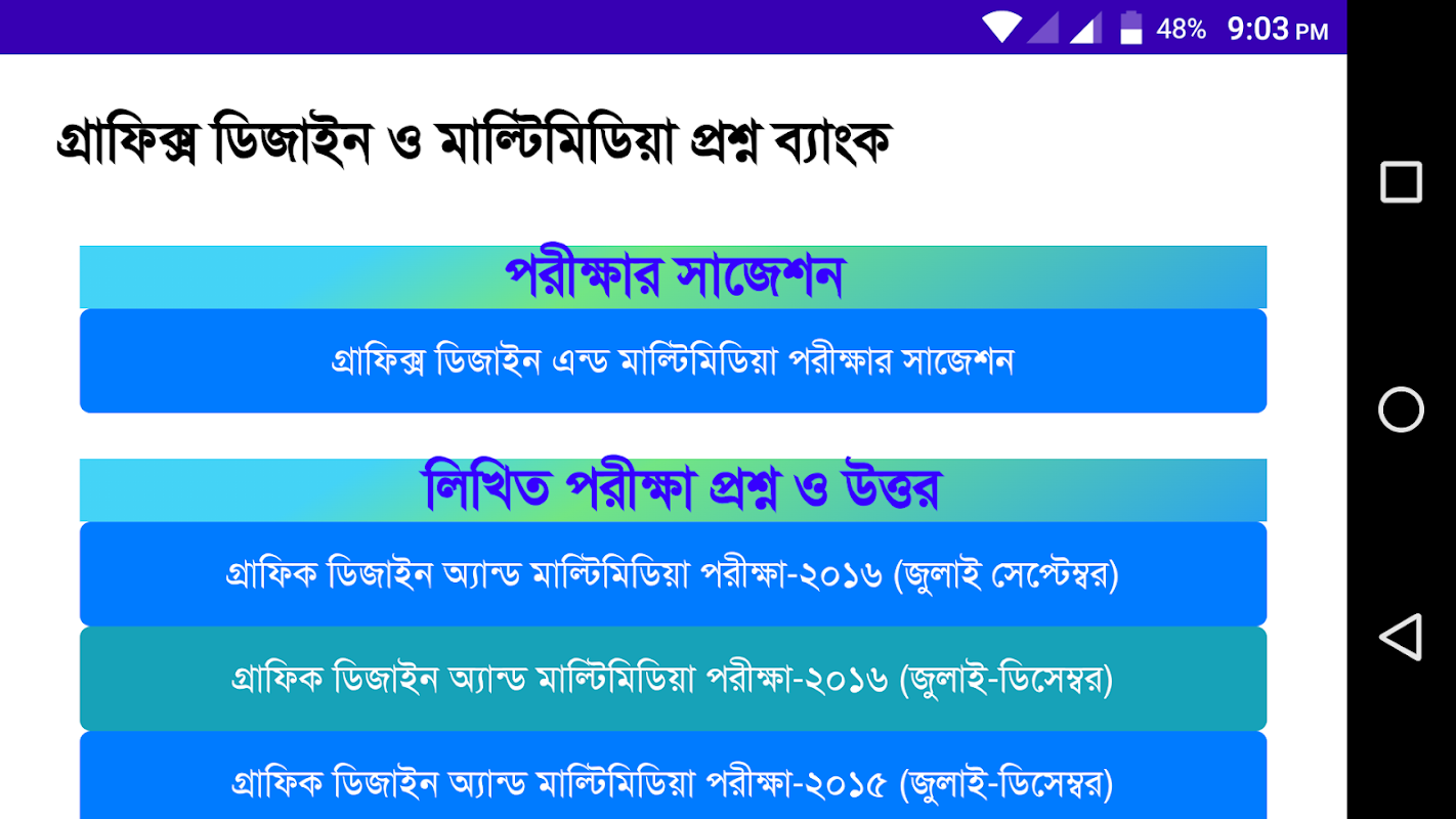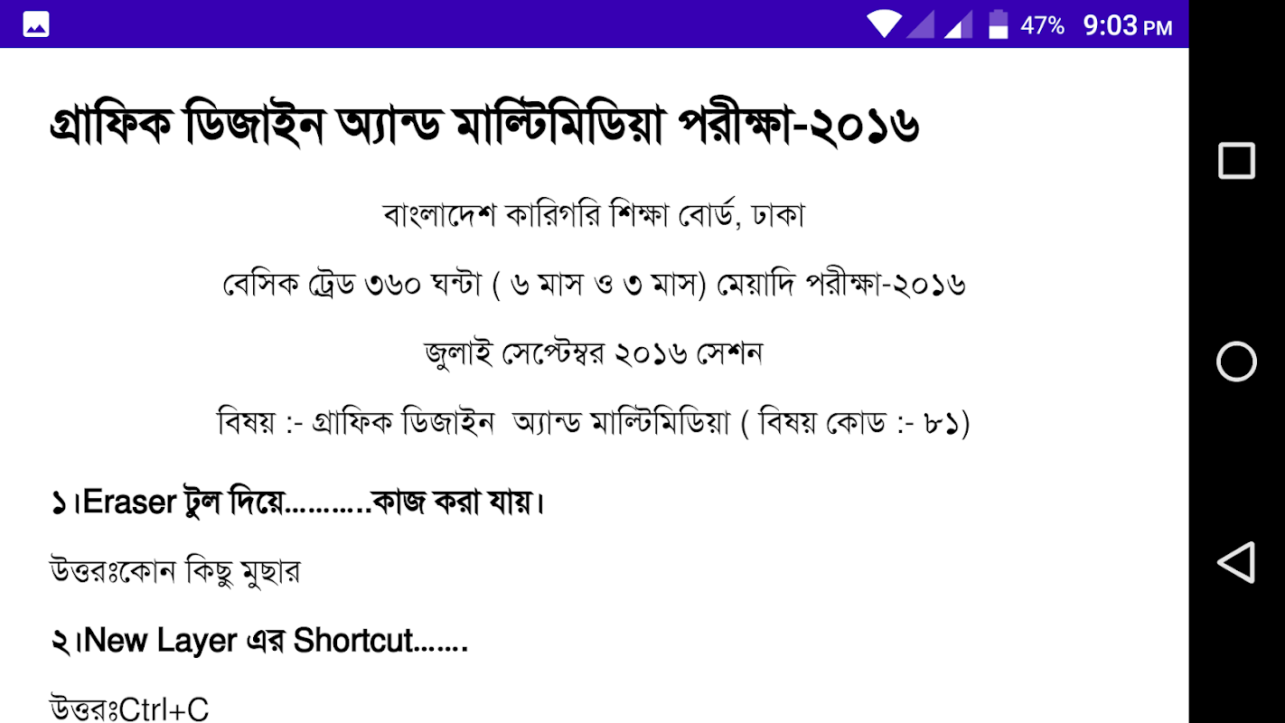 বাংলাদেশ কারিগরি শিক্ষা বোর্ড এর অধীনে পরিচালিত হয় গ্রাফিক্স ডিজাইন এন্ড মাল্টিমিডিয়া কোর্স ৩মাস ও ৬ মাস মেয়াদী বেসিক ট্রেড (৩৬০ ঘন্টা) কোর্সটির বোর্ডের প্রশ্ন ও উত্তর নিয়ে এই এপটি তৈরি করা হয়েছে এখানে লিখিত ও ব্যবহারিক পরীক্ষার প্রশ্ন ও উত্তর এবং সাথে সাজেশন দেওয়া হয়েছে এই এপটি গ্রাফিক্স ডিজাইন এন্ড মাল্টিমিডিয়া কোর্সের প্রস্তুতি নিতে সহায়ক হবে