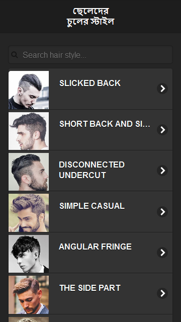 যারা চুলের যত্ন করতে কিংবা চুলের স্টাইল করতে পছন্দ করেন তাদের জন্য এই চুলের স্টাইল এপ। ছেলেদের চুলের স্টাইল এপটিতে রয়েছে আধুনিক সব স্টাইলিস্ট চুলের কাটিং। রয়েছে প্রতিটি স্টাইলের নাম ও ছবি।