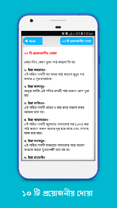 We find various types of books in the market or library such as: Door Dhandara and Fazilat Chhoti, small books of prayer, books, prayers and prayers - namaz shikkha bangla, work and fazilat etc. are found in which many important things are known. Let's change your daily life by doing this in our app. And encourage your good deeds. Besides, you can download Quran Recitation audio or mp3 app on your mobile to do more good work. So that you can always read or read the Quran recitation. Our app offers great blessings, the best prayers described in the Quran, the duaah is pleased with God, the prayer of being safe from accidents, blessings for the time of distress, the release of debt, 10 necessary prayers, prayers before going to bed and getting up, while entering the mosque There are numerous duaas including Hadith and some Naseehaha. So wait for us to download this mobile app today.
