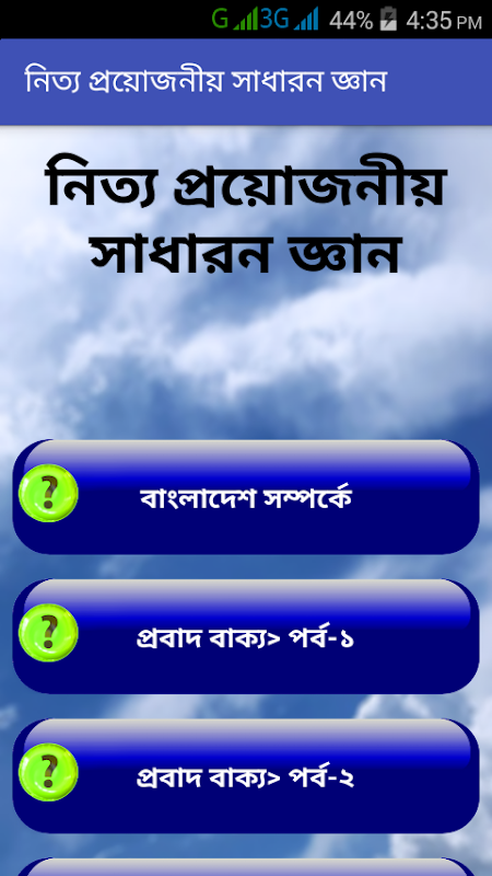 নিত্য প্রয়োজনীয় সাধারণ জ্ঞান একটি বাংলা শিক্ষামূলক অ্যাপ । এই সাধারণ জ্ঞান apps থেকে আপনি বাংলাদেশ ও আন্তর্জাতিক বিষয় সহ আরও অনেক বিষয়ে জ্ঞান লাভ করতে পারবেন যা আপনার প্রতিটা ক্ষেত্রে কাজে লাগবে।