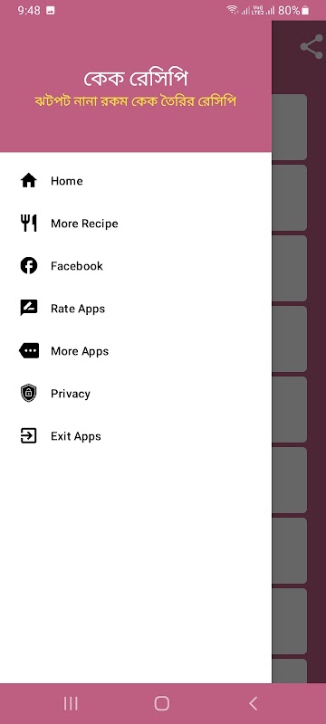 Cake Recipe app is completely free and very easy to use. This app has many delicious and short time recipes. All recipes are very simple. Everyone can make a good and tasty cake with our app. You can eat it at home with your family.