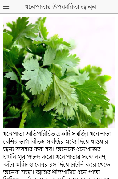 ধনেপাতা অতিপরিচিত একটি সবজি। ধনেপাতা বেশির ভাগ বিভিন্ন সবজির মধ্যে দিয়ে খাওয়ার জন্য ব্যবহার করা হয়। অনেকে ধনেপাতার চাটনি খুব পছন্দ করে। ধনেপাতার সঙ্গে লবণ, কাঁচা মরিচ ও লেবুর রস দিয়ে চাটনি করে খেতে অনেক মজা। আবার শীলপাটায় ধনে পাতা পিষিয়ে ভর্তা করলে তা অতি মুখরোচক হয়। যা ভাতের সাথে অনেক মজাদার। ত বে আমাদেরদেশে বেশির ভাগ শহরের মানুষ ধনেপাতা তরকারির মধ্যে ও সালাদে ব্যবহার করে থাকে। অনেকেই এই ভেবে পছন্দ করে ধনেপাতা তরকারির মধ্যে দিলে ও সালাদে দিলে একটা সুন্দর সুগন্ধ নিয়ে আসে। কিন্তু অনেকে আবার ধনেপাতা পছন্দ করে না। তারা ধনেপাতার গন্ধকে অপছন্দ করে খেতে চাই না। ধনেপাতার নানা ঔষধি গুণ রয়েছে।