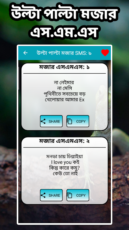 অ্যাপটি সংগ্রহ করে রাখুন আর উল্টা পাল্টা মজার এস.এম.এস পাঠিয়ে ভালোবাসার মানূষটিকে খুশি করতে পারেন ।