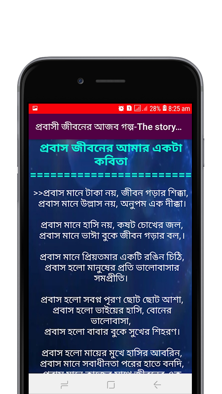 প্রবাসীদের জীবন অনেক কষ্টের? আর প্রবাসীদের বাস্তব জীবন নিয়েই এখানে সাজানো হয়েছে আপনাদের জন্য কিছু সুন্দর গল্প। এই অ্যাপ এর গল্প গুলো পড়লে আপনার চোখ ভিজে আসবে কান্নায়। সকল প্রবাসী ভাইদের প্রতি শ্রদ্ধা ও সালাম রেখে।প্রবাসীদের দুঃখ কষ্ট নিয়ে বাংলা গল্পগুলো লেখা হলো ।