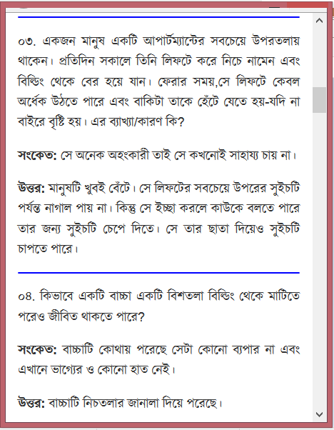 আমাদের এই অ্যাপটি মোটামোটি এক হাজারের মত ধাঁধা এবং ঝটপট প্রশ্নের উত্তর নিয়ে ডেভেলপ করা হয়েছে। এটি খুব সহজভাবে সাজানো হয়েছে। এই অ্যাপটি আশা করি ব্যবহারকারীদের জন্য অনেক গুরুত্বপুর্ন একটি অ্যাপ হবে এবং তদের অনেক উপকারে আসবে।