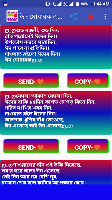 মাহে রমযান শেষে পবিত্র ঈদুল ফিতরের আনন্দে মেতে উঠবে সবাই।শুভেচ্ছা বার্তা যানাবে সবাইকে।ঈদ আনন্দ উপভোগ করবে সবাই একসাথে। একে অপরকে eid mubarak শুভেচ্ছা বার্তা দিয়ে নিবেদন করবে।তাই ঈদ মোবারক অ্যাপসটি।সবাইকে ঈদ মোবারক এসএমএস দিয়ে দাওয়াত দিন নুতন সব এসএমএস দিয়ে।বাছাই করা সব এসএমএস।কপি ও সেন্ড করার সুবিধা রয়েছে।সবার আগে ঈদের মেসেজ দিয়ে নিবেদন করুন দাওয়াত দিন।ঈদের আনন্দ ছরিয়ে দিন সবার মাঝে।