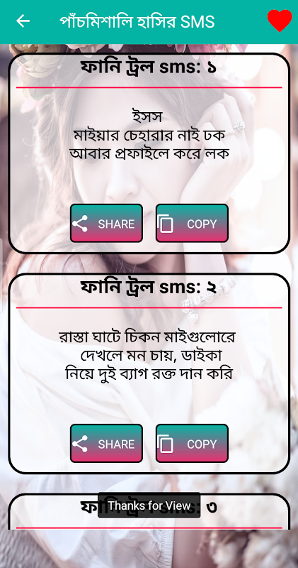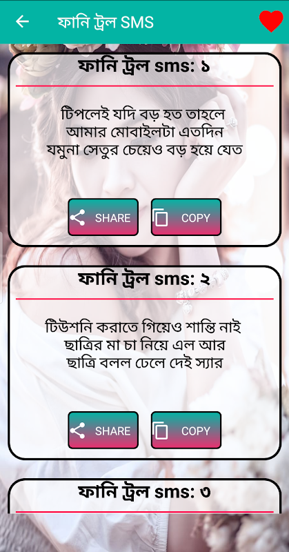 এই অ্যাপসটিতে যে সব ফানি ট্রল sms আছে তা আপনি আপনাদের ফ্রেন্ডদের সাথে শেয়ার করতে পারবেন ।