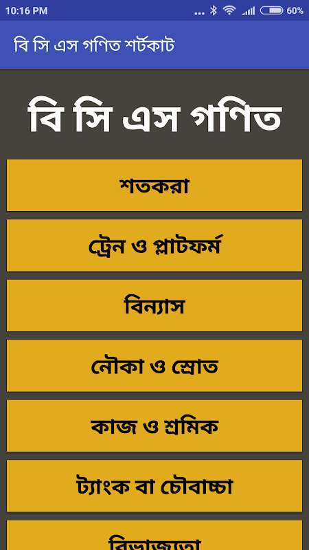 Math tricks as well as math shortcut app is brought to you by shikder studio. Gonit sutro or goniter shortcut app is the best app for math lover. If you know math tricks then it will be very easy for you to solve bcs question bank and solution . In my point of view bcs question bank and solution is possible to solve through this math shortcut tricks in bengali application. There are some app on store based on bcs question bank and also bcs math . you can also solve the problem by this math tricks .