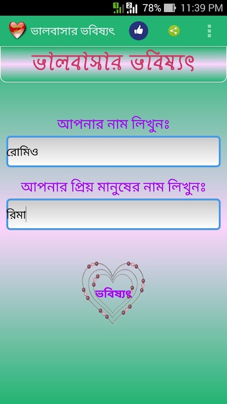 সুতরাং এক্ষুনি download করুন ভালবাসার ভবিষ্যৎ(Love Future) এবং ভালবাসার পরিমাণ(Love Calculator) বাংলা তে।