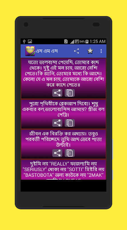 ভালোবাসার মানুষ কে খুশি রাখতে প্রয়োজন হয় কবিতা অথবা এসএমএস আর এই এস এম এস সবাই সাজিয়ে লিখতেও পারেন না। তাহলে কি করবেন? চিন্তা নেই আমরা আপনাদের জন্য নিয়ে এলাম ভালবাসার এস এম এস আপনি শুধু পড়বেন আর যেটা পছন্দ সেটা ক্লিক করে পাঠিয়ে দিবেন আপনার প্রিয় মানুষ কে। এর জন্য আমরা ভালোবাসার মেসেজ অ্যাপ টি তে রেখেছি sms কপি ও সরাসরি সেন্ড করার অপশেন।