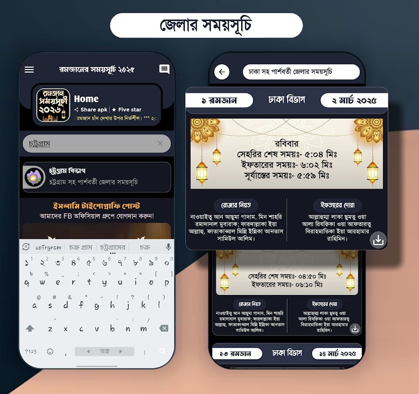 ২০২৬ সালের রমজানের ইফতার ও সেহরির সময়সূচী। ইসলামিক ফাউন্ডেশন থেকে ২০২৬ সালের রমজানের সময়সূচী প্রকাশ করা হয়েছে, এবং আমরা এ থেকে সকল জেলার জন্য রমজানের সময়সূচি তুলে ধরেছি। অ্যাপটি ভালো লাগলে ফাইভ স্টার রিভিউ দিয়ে আপনার মতামত কমেন্টের মাধ্যমে আমাদের জানান। ধন্যবাদ…