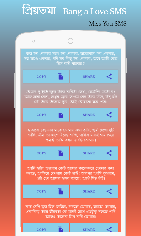 বন্ধুরা এই অ্যাপটির মধ্যে আপনারা নানান ক্যাটাগরির অসংখ্য নতুন নতুন বাংলা ভালোবাসার এসএমএস ও কবিতা পাবেন ।