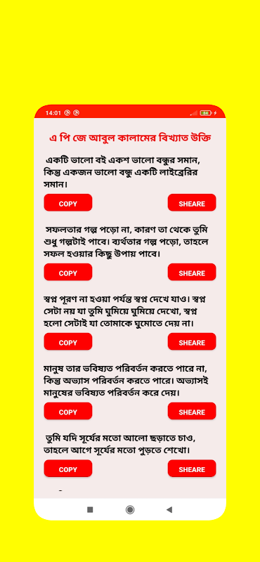 তাছাড়াও এই এপসটির ভিতর রয়েছে বিখ্যাত ব্যক্তি এ পি জে আবুল কালামের মহামূল্যবান কিছু উক্তি। আরো রয়েছে জীবনকে বদলানো ও সফল হিসাবে নিজেকে গড়ে তুলার জন্য গুরুত্বপূর্ণ কিছু বাণী বা উক্তি। এখানে আরো পাবেন Life changing quots, motivational quotes, মোটিভেশনাল উক্তি। যে গুলো একবার পড়লে আপনার ভিতর একটা আলাদা শক্তি কাজ করবে। যার মাধ্যমে আপনি আপনার জীবনের সকল ব্যর্থতাকে সফলতায় রুপ দিতে পারবেন। ইংশাআল্লাহ।