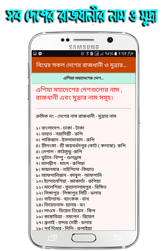 সব থেকে ভাল ব্যাপার হল আপনাদের দেশ, রাজধানী ও মুদ্রার নাম গুলো মনে রাখার জন্য শর্টকাট উপায় রাখা হয়েছে...যা আপনাদের বিভিন্ন পরিক্ষায় কাজে দিবে...