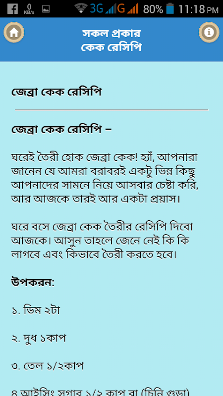 বর্তমান সময়ে কেক ছাড়া কোন অনুষ্ঠান কিনবা উৎসব যেন চিন্তাই করা যায় না বরং একটি সুন্দর, সুসাধু কেকই হয়ে উঠে আনন্দের মূল উপকরণ আর সেই কেকটি যদি হয় নিজেদের হাতে বানানো তাহলেতো কোন কথাই নেই। হাঁ এই অ্যাপ এ আমরা বেস কিছু কেকের জাধুকরি রেসিপি নিয়ে আলোচনা করেছি যা অনুসরণ করে আপনি বাসাই বসেই বিভিন্ন প্রকার কাকে বানাতে পারবেন।